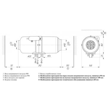 Отопитель требует подключения к сети постоянного тока 24В. Забор топлива производится по топливопроводу, который может заводиться в штатный бак с помощью топливозаборника, или же в отдельный бак.